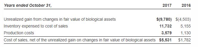 Cost of sales is expected to vary on a quarterly basis, depending on the number of pre-harvest plants, the strains being grown and where the pre-harvest plants are in the growth cycle at the end of the reporting period. Cost of sales during the year ended October 31, 2017 includes depreciation of $1.2 million (2016 – $0.4 million) for both the POD and BGC facilities. Growing activities in the POD facility ramped up gradually throughout the year. For the years ended October 31, cost of sales was composed of the following: