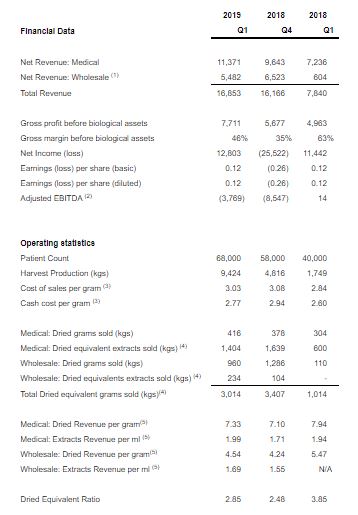 - Record quarterly revenue of $16.9 million, a 115% increase over the first quarter of 2018, 67% was through the medical channel and 33% through the recreational channel;
