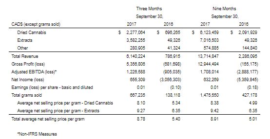 - Completed our first harvest from our Niagara Facility and full utilization from Phase 1 is expected in December 2017