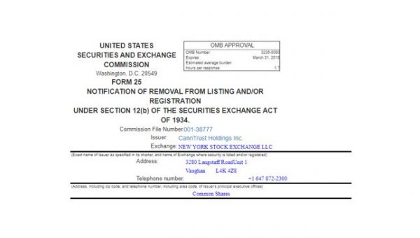 CannTrust (TSX: TRST) (NYSE: CTST), which has been suspended from trading since March 31st on both the Toronto Stock Exchange and the New York Stock Exchange after seeking protection from creditors, stated then that its shares would soon be delisted from both exchanges. On April 9th, the company disclosed that it will be delisted from the Toronto Stock Exchange at the close of business on May 6th. On Thursday, the New York Stock Exchange issued a Form 25 notifying that CannTrust will be delisted on the open of business on April 27th.