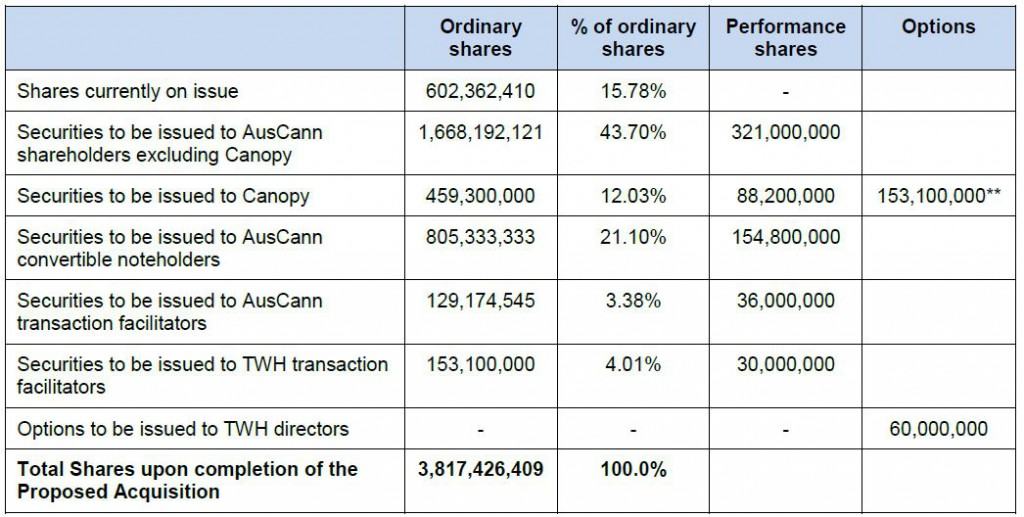 As part of the alliance with Canopy, AusCann has agreed to issue a 15 per cent stake in AusCann shares in exchange for access to Canopy’s vast range of expertise and intellectual property in cultivation, manufacturing and supply of high quality medicinal cannabis. These shares will remain in a voluntary three year lock up/escrow. In effecting an acquisition by TWH, these new shares will be included within the consideration already allocated to AusCann shareholders as set out in more detail below.