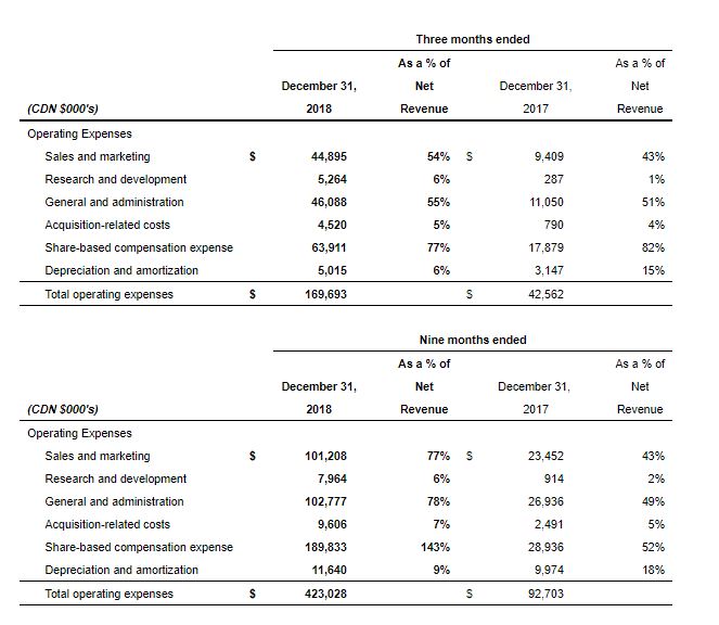 Businesses built on top quality product and customer service require upfront investment. Management believes foundational investment is required to build the Company’s significant and diversified production platform, flexible distribution capability, world-leading brands, retail capabilities, medical and recreational sales and customer support capabilities. Canopy Growth also requires robust information technology infrastructure, international business development and operations. These investments directly impacted profitability in the quarter but represent prudent long term investments to strengthen the Company’s global leadership position. Both sales and marketing and general and administrative expenses were up significantly relative to the same period last year. Management expects these expenses to level off in the near term in its Canadian operations.