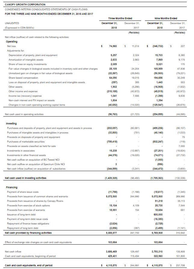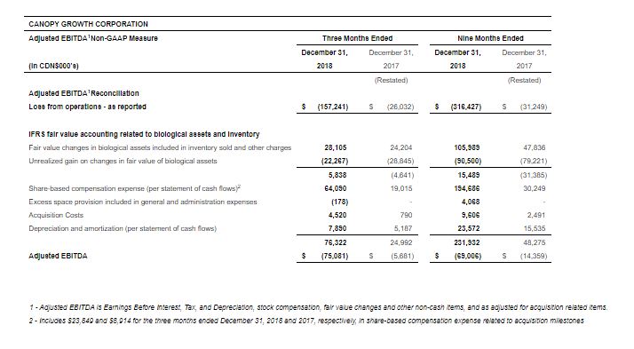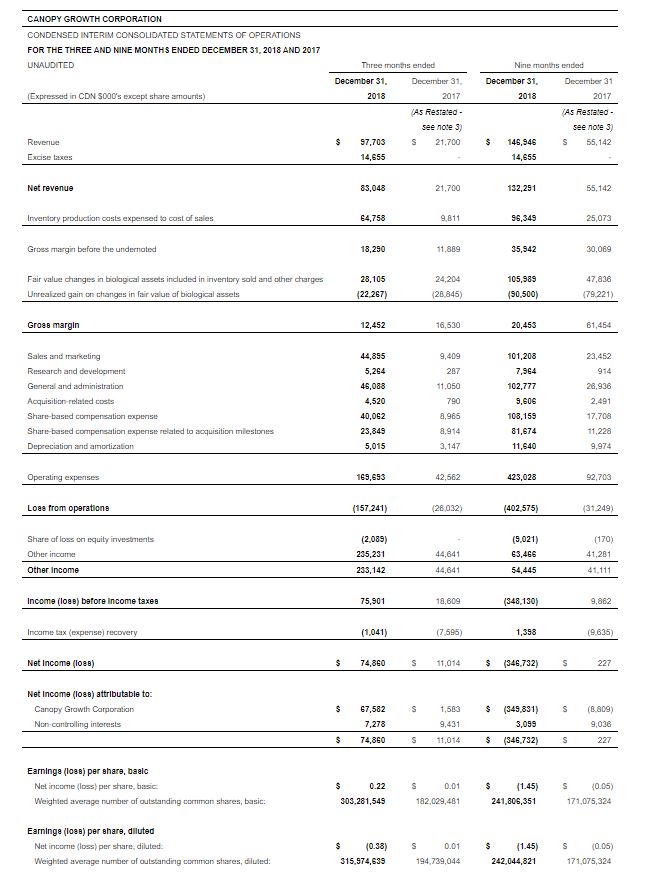 SMITHS FALLS, ON, Feb. 14, 2019 /PRNewswire/ – Canopy Growth Corporation (TSX: WEED) (NYSE: CGC) (“Canopy Growth” or “the Company”) today released its consolidated financial results for the third quarter fiscal 2019 ended December 31, 2018. All financial information in this press release is reported in Canadian dollars, unless otherwise indicated.