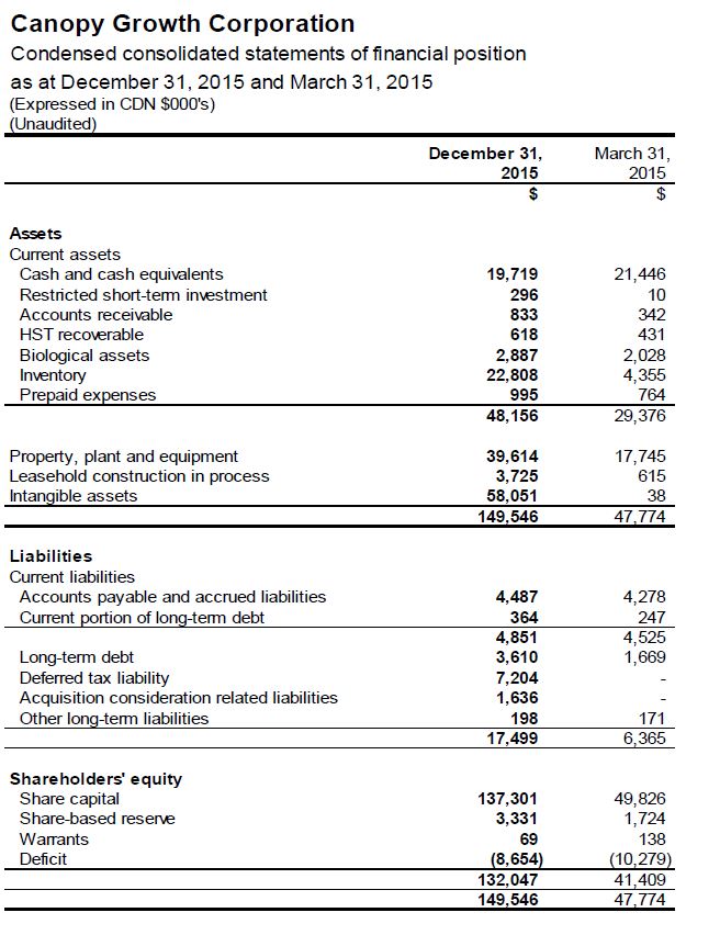 SMITHS FALLS, ON , Feb. 25, 2016 /CNW/ – Canopy Growth Corporation (“Canopy Growth” or “the Company”) (CGC.V) today released its financial results for the third quarter of fiscal year 2016 ended December 31, 2015 . All financial information in this press release is reported in Canadian dollars, unless otherwise indicated.