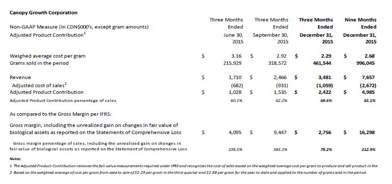 The Company’s “Adjusted Product Contribution”1 is a Non-GAAP metric used by management which adjusts the reported gross margin by excluding the fair value measurements as required by IFRS and measures the cost of sales for the grams actually sold in the period. Management believes this measure provides useful information as it reflects the gross margin based on the Company’s weighted average cost per gram from seed to sale against the grams sold. The resulting Adjusted Product Contribution is $2 .4 million, or 70% of sales, in the third quarter ended December 31, 2015 and $5 .0 million, or 65% of sales, on a year to date basis to December 31 , 2015.