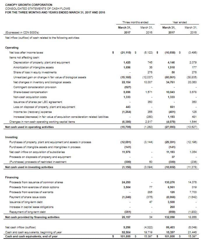 At March 31, 2017, the Company’s cash and cash equivalents totaled $101.8 million, representing an increase of $86.4 million from March 31, 2016, principally due to cash received from the bought deal financings that closed on, April 15, 2016, August 24, 2016 and December 22, 2016, a private placement that closed on March 22, 2017, and options exercised, combined totaling $129.3 million, net of share issue costs, which also includes $1.0 million of share issue costs associated with the Mettrum acquisition. The increase also included $3.5 million in mortgage proceeds received in the second quarter and $12.3 million in net cash acquired at closing of the Mettrum acquisition, offset by capital expansion totaling $29.4 million and to fund the cash applied to operating activities of $27.1 million.