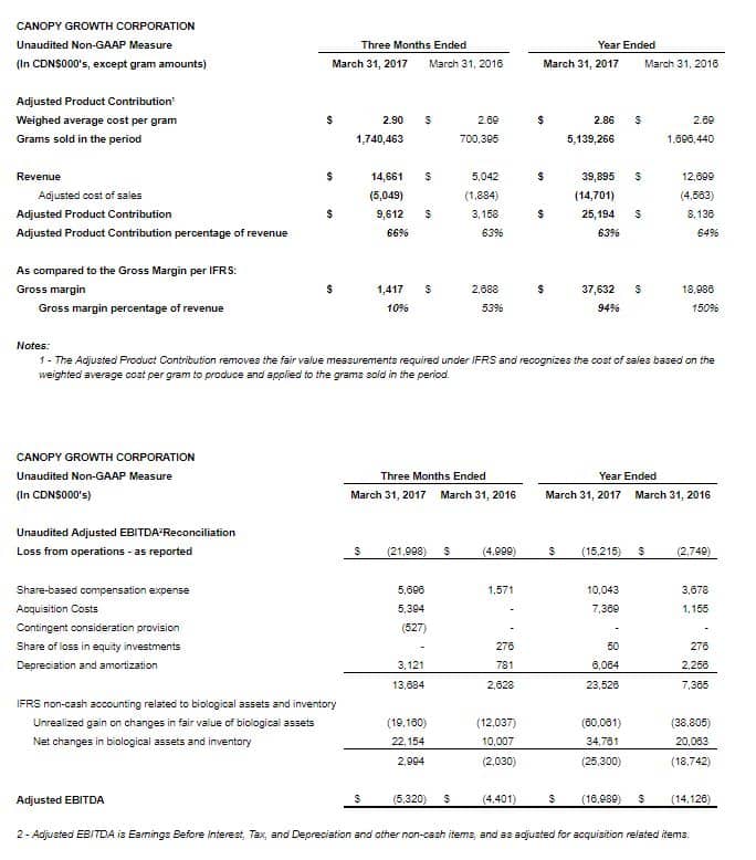 SMITHS FALLS, ON, June 27, 2017 /CNW/ – Canopy Growth Corporation (TSX: WEED) (OTC: TWMJF) (“Canopy Growth” or “the Company”) today released its financial results for the fourth quarter and fiscal year 2017, the period ended March 31, 2017. All financial information in this press release is reported in Canadian dollars, unless otherwise indicated.
