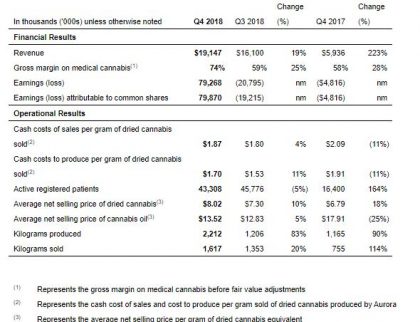 Aurora Cannabis Inc. Announces Results for the Fourth Quarter and 2018 Fiscal Year 223% Top Line Annual Revenue Growth Well Positioned for Canadian Adult Consumer Use Market Process Commenced...