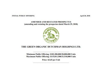 The Green Organic Dutchman Files Amended and Restated Preliminary Prospectus for Initial Public Offering of Units TORONTO, March 14, 2018 /CNW/ – The Green Organic Dutchman Holdings Ltd. (the...