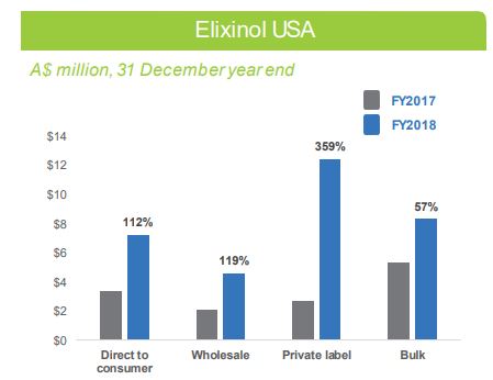 The company operates three businesses, including Nunyara, which is seeking a medical cannabis license in Australia, Hemp Foods Australia and Elixinol, which sells CBD products derived from industrial hemp. Elixinol accounted for 87% of sales and grew 141% in 2018, with private-label sales leading the way, with 359% growth:
