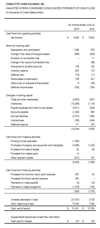 The Company’s unaudited interim condensed financial statements and accompanying notes for the periods ended June 30, 2019 and 2018 and related management’s discussion and analysis of financial condition and results of operations (“MD&A”) are available under the Company’s profile on SEDAR at www.sedar.com and on the Investor Relations section of the Company’s website at https://investors.charlottesweb.com.