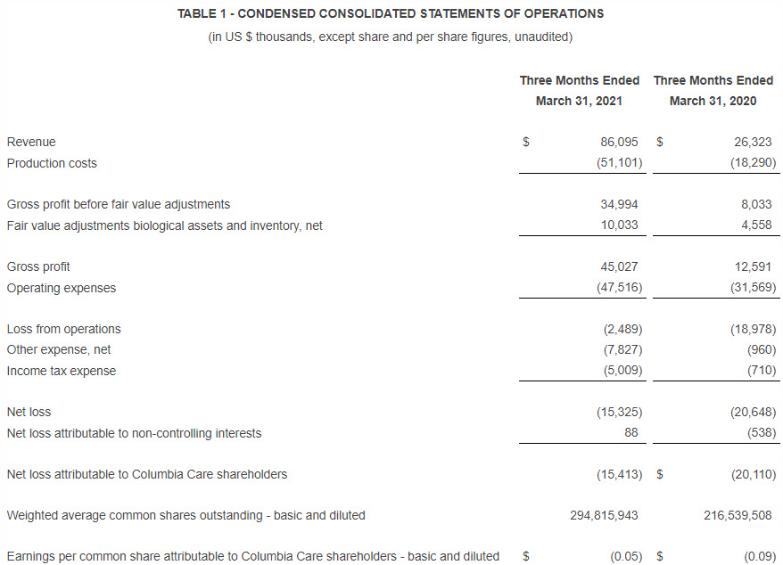 “We sustained our record 2020 momentum into the first quarter of 2021, with significant growth across both the top and bottom line,” said Nicholas Vita, CEO of Columbia Care. “Our combined revenue results reflect organic growth and further integration progress on key California and Colorado acquisitions”.