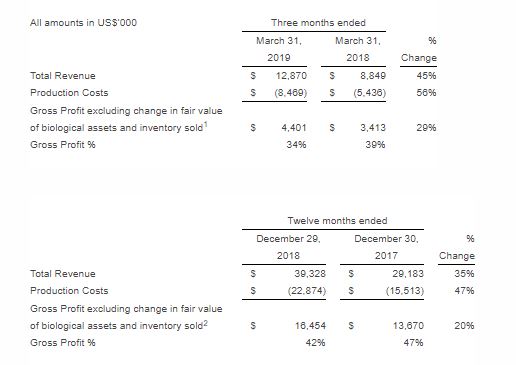 Gross profit, excluding change in fair value of biological assets and inventory sold, for the first quarter of 2019 and full year 2018 increased 29% and 20% respectively from prior year periods.