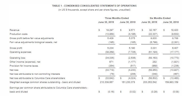 NEW YORK, August 06, 2019–(BUSINESS WIRE)–Columbia Care Inc. (NEO: CCHW) (OTCQX: CCHWF) (FSE: 3LP) (“Columbia Care” or the “Company”), one of the largest fully integrated operators in the global medical cannabis industry with licenses across the US and EU, today reported financial and operating results for its second quarter ended June 30, 2019. All financial information is provided in US dollars unless otherwise indicated.