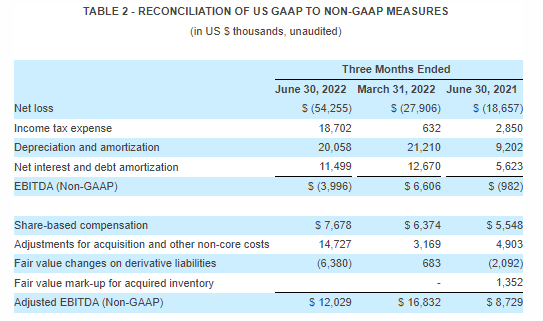 With respect to non-GAAP financial measures, the Company defines EBITDA as net income (loss) before (i) depreciation and amortization; (ii) income taxes; and (iii) interest expense and debt amortization. Adjusted EBITDA is defined as EBITDA before (i) share-based compensation expense; (ii) adjustments for acquisition and other non-core costs; (iii) fair value changes on derivative liabilities; and (iv) fair value mark-up for acquired inventory. Adjusted EBITDA Margin is defined as Adjusted EBITDA divided by Revenue. Adjusted Gross Profit is defined as gross profit before the fair mark-up for acquired inventory. Adjusted Gross Margin is defined as gross margin before the fair mark-up for acquired inventory.