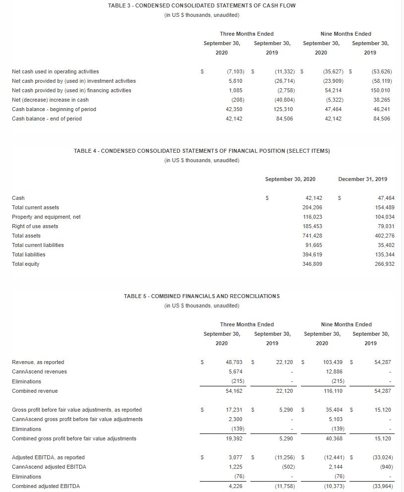 Third quarter 2020 combined and reported results include one month of contribution from The Green Solution (TGS) in Colorado, which the Company acquired on September 1, 2020. For the month of September, TGS generated approximately $9.5 million of revenue, $4.3 million of gross profit, and $2.4 million of adjusted EBITDA. Through the third quarter, pro forma including the TGS acquisition, Columbia Care had Combined Revenue, Gross Profit and Adjusted EBITDA of $178.6 million, $68.6 million and $1.4 million, respectively.