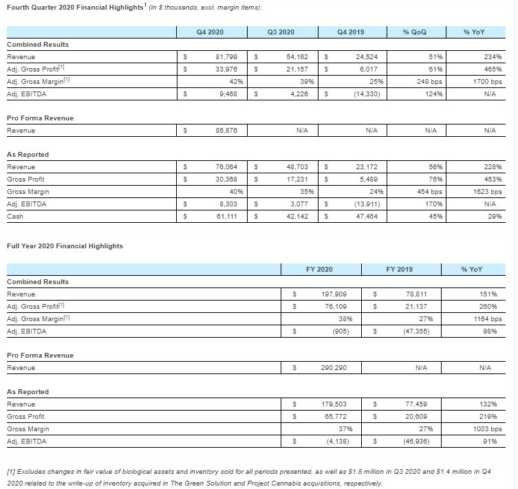 Fourth quarter 2020 combined and reported results include one full quarter of contribution from The Green Solution (TGS) in Colorado, which the Company acquired on September 1, 2020, as well as partial contribution from Project Cannabis, which the Company acquired on December 2, 2020.