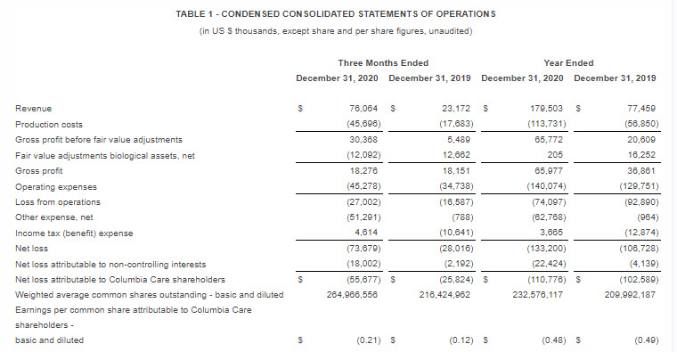 NEW YORK-March 16, 2021-(BUSINESS WIRE)–Columbia Care Inc. (NEO: CCHW) (CSE: CCHW) (OTCQX: CCHWF) (FSE: 3LP) (“Columbia Care” or the “Company”) today reported financial and operating results for the fourth quarter and full year ended December 31, 2020. All financial information is audited and provided in US dollars unless otherwise indicated.