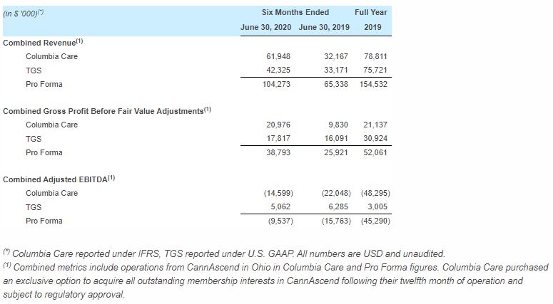 - Pro Forma 2020 Combined Revenue Guidance of USD$234-$265M Reaffirmed, Combination Brings Columbia Care to Adj. EBITDA Positive in 3rd Quarter