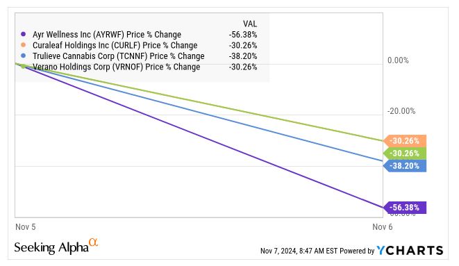 Are these companies a buy? Well, I think Verano is, but it reported a Q3 that was weaker than expected today. I continue to think that Ayr Wellness and Curaleaf do not look attractive due to their balance sheets, while Trulieve is better than it was recently. I downgraded it at Seeking Alpha recently to Sell, and I would now be Neutral if I were to write about it again. Trulieve and Curaleaf reported disappointing Q3 financials as well.
