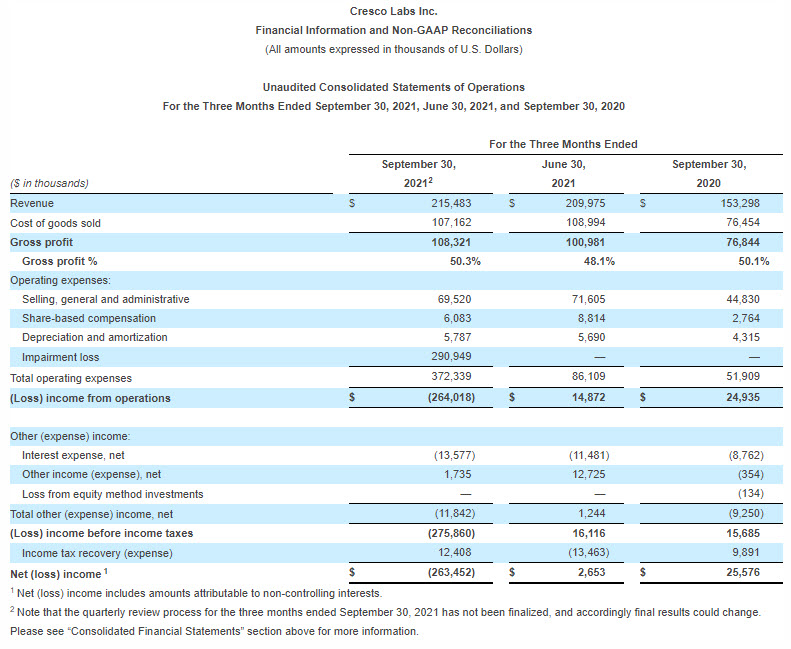 The financial information reported in this press release is based on unaudited management prepared financial statements for the three and nine months ended September 30, 2021. These financial statements have been prepared in accordance with U.S. GAAP. This release contains certain preliminary financial results for third quarter of 2021, including Cost of goods sold; Gross profit; Depreciation and amortization; Impairment loss; Interest expense, net; Other income (expense), net; Income tax recovery (expense); Net loss; Inventory, net; Property and equipment, net; Intangibles, net; Goodwill; and Deferred, contingent consideration and other payables, short-term. These preliminary results for the three months ended September 30, 2021 are provided prior to completion of all internal and external reviews and therefore are subject to adjustment until the filing of the Company’s quarterly financial statements, which the Company expects to file on SEDAR during the week of November 15, 2021. The review of the unaudited consolidated financial statements for the three and nine month periods ended September 30, 2021 by the Company’s auditors is currently in process. All financial information contained in this press release is qualified in its entirety with reference to such financial statements. While the Company does not expect there to be any material changes between the information contained in this press release and the consolidated financial statements it files on SEDAR, to the extent that the financial information contained in this press release is inconsistent with the information contained in the Company’s financial statements, the financial information contained in this press release shall be deemed to be modified or superseded by the Company’s filed financial statements. The making of a modifying or superseding statement shall not be deemed an admission for any purposes that the modified or superseded statement, when made, constituted a misrepresentation for purposes of applicable securities laws. Further, the reader should refer to the additional disclosures in the Company’s audited financial statements for the year ended December 31, 2020, prepared under International Financial Reporting Standards (“IFRS”) and previously filed on SEDAR.