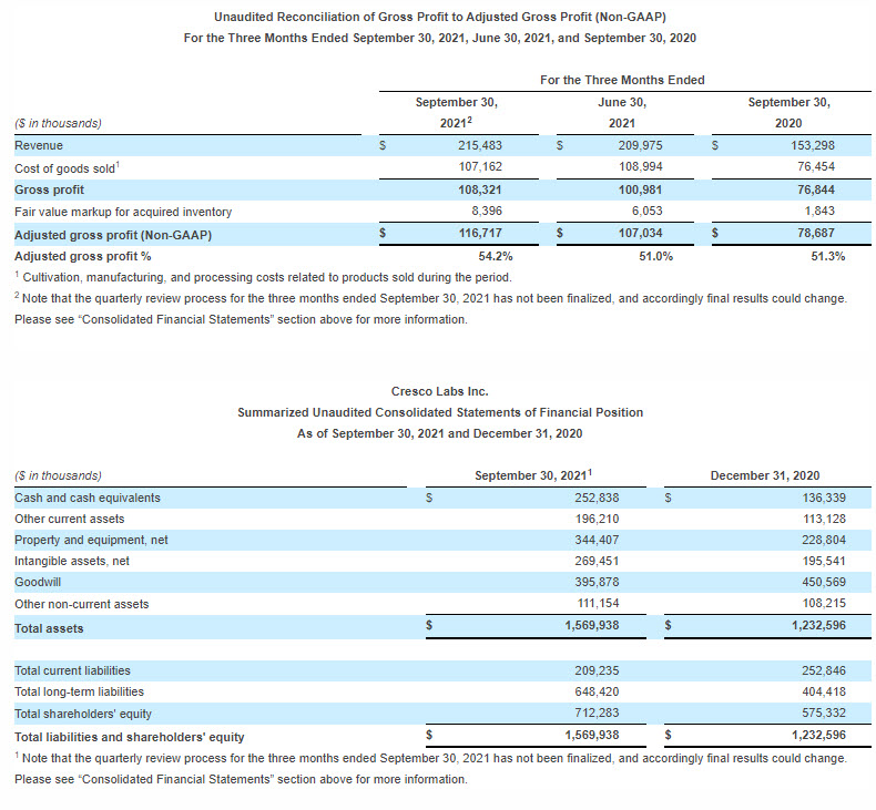 CHICAGO, November 11, 2021–(BUSINESS WIRE)-Cresco Labs Inc. (CSE: CL) (OTCQX: CRLBF) (FSE: 6CQ) (“Cresco Labs” or the “Company”), a vertically integrated, multi-state operator and the number one U.S. wholesaler of branded cannabis products, today announced its financial results for the third quarter ended September 30, 2021. All financial information presented in this release is reported in accordance with U.S. Generally Accepted Accounting Principles (“U.S. GAAP”) and U.S. dollars, unless otherwise noted, and all comparisons to prior quarter and prior year are made on an as-converted basis under U.S. GAAP.