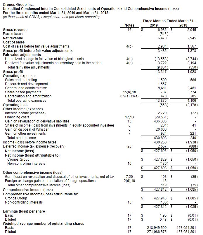 In the first quarter 2019, Cronos Group recorded a non-cash unrealized gain on revaluation of derivative liabilities of $436.4 million.