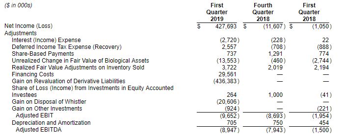 Adjusted earnings before interest and tax (“Adjusted EBIT”) is used by management as a supplemental measure to review and assess operating performance and trends on a comparable basis. Adjusted EBIT is defined as net income or loss, excluding interest expense, interest income, deferred income tax expense or recovery, share-based payments, unrealized change in the fair value of biological assets, realized fair value adjustments on inventory sold, financing costs, gain on revaluation of derivative liabilities, share of income or loss from investments in equity accounted investees and gain or loss on investments. The Company believes that Adjusted EBIT is useful to compare its operating profitability across periods. A reconciliation of Adjusted EBIT to net income, the most directly comparable IFRS measure, is provided below.