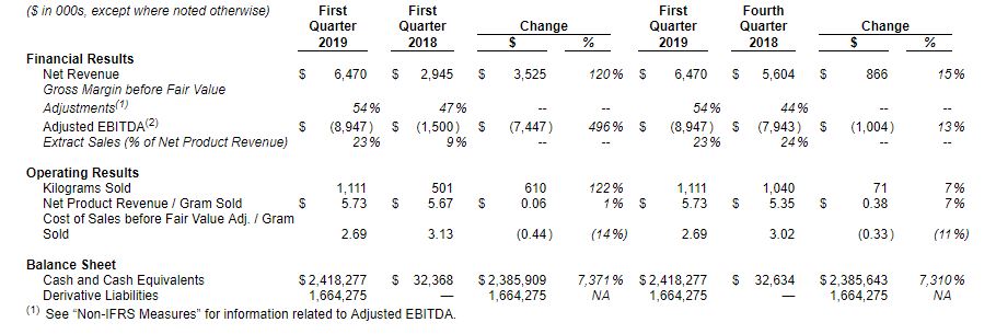 - Net revenue was $6.5 million in first quarter 2019, representing a 120% increase from $2.9 million in first quarter 2018, primarily driven by the launch of the adult-use market in Canada. Net revenue increased 15% quarter-over-quarter from $5.6 million in fourth quarter 2018, primarily driven by increased sales in CBD oil, which carries no excise tax reduction and increased sales of dry flower.