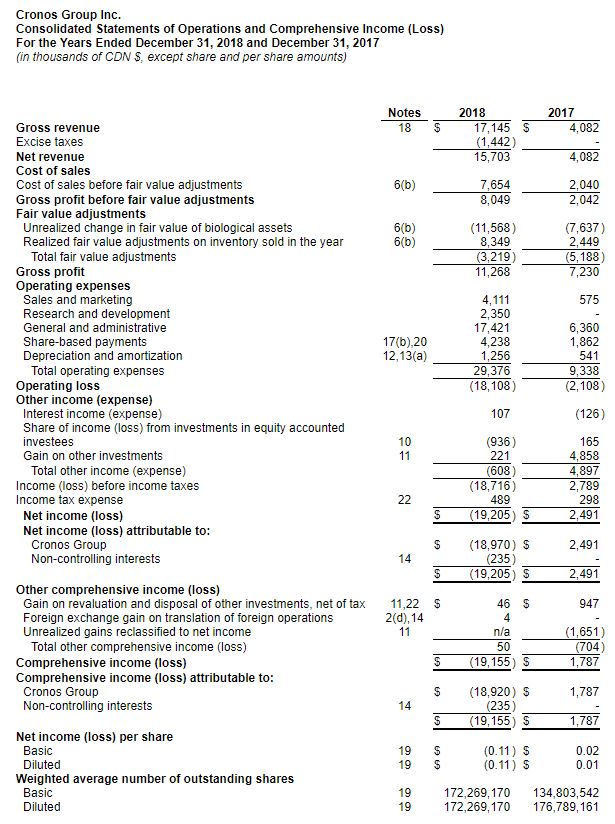 Cronos Group reported net revenues of $5.6 million in the fourth quarter 2018 as compared to $1.6 million for the fourth quarter 2017, representing an increase of $4.0 million, or 248%. The increase in revenue was driven by shipments to the Canadian adult-use market and growth in cannabis oil revenue. For full year 2018, the Company reported net revenue of $15.7 million as compared to $4.1 million for full year 2017, representing an increase of $11.6 million, or 285%. The increase in revenues was driven by increased production capacity, commencement of shipment into the Canadian adult-use market, growth of the Company’s medical client base and growth in cannabis oil revenues.