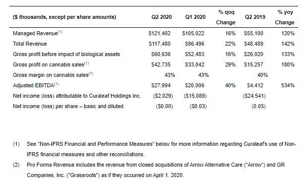 Joseph Lusardi, Chief Executive Officer of Curaleaf stated “Curaleaf, once again, delivered record quarterly results highlighted by managed revenues exceeding our outlook, as well as, a 40% sequential improvement in Adjusted EBITDA. The outstanding results come despite headwinds related to temporary COVID-19 related closures and restrictions in Massachusetts and Nevada. After quarter end, we successfully completed the transformative acquisition of Grassroots, expanding our presence into 6 new states, including the high-growth Illinois and Pennsylvania markets.”
