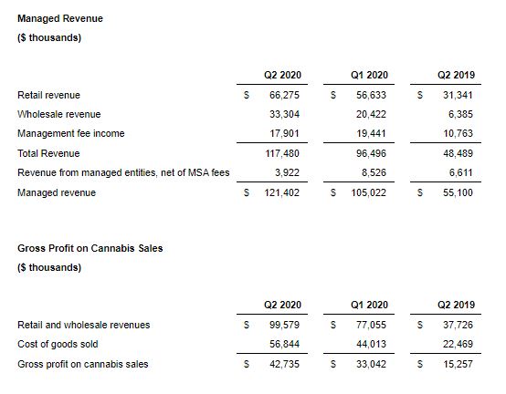 Gross profit on cannabis sales was $42.7 million for the second quarter of 2020, resulting in a 43% margin, compared to $15.3 million in the second quarter of 2019. The increase was primarily due to the continued improvement in the operating capacity and efficiency of the Company’s cultivation and processing facilities.