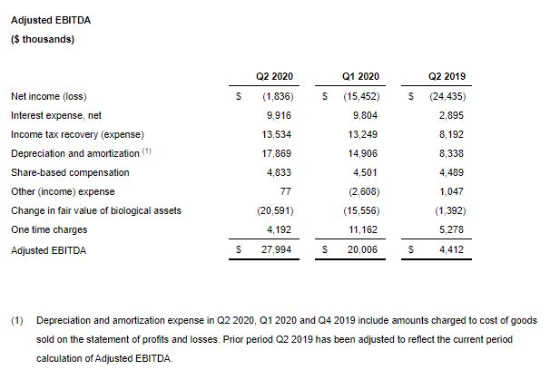 Net loss for the second quarter of 2020 was $2.0 million, compared to a net loss of $24.5 million in the second quarter of 2019. The increase was primarily driven by a $19.2 million increase in the fair value of biological assets and a $1.1 million decrease in one-time charges. These benefits were partially offset by a $9.5 million increase in depreciation and amortization and a $0.3 million increase in share-based compensation, both of which are non-cash, a $5.3 million increase in income tax expense, and a $7.0 million increase in net interest expense.