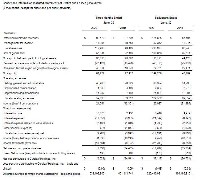 WAKEFIELD, Mass., Aug. 17, 2020 /PRNewswire/ — Curaleaf Holdings, Inc. (CSE: CURA) (OTCQX: CURLF) (“Curaleaf” or the “Company”), a leading vertically integrated cannabis operator in the U.S., today reported its financial and operating results for the second quarter ended June 30, 2020. All financial information is provided in U.S. dollars unless otherwise indicated.