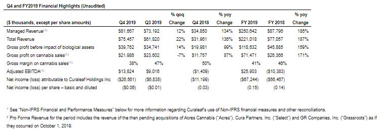 Curaleaf Reports Record Fourth Quarter and Fiscal Year End 2019 Financial and Operational Results