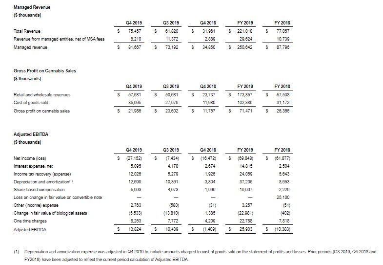 Gross profit before impact of biological assets for the fourth quarter of 2019 was $39.8 million, compared to $20.0 million for the fourth quarter of 2018. The increase was due to continued improvement in the operating capacity of the Company’s cultivation and processing facilities.