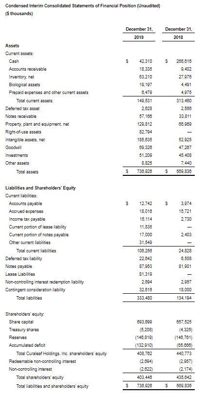 Net loss for 2019 was $69.8 million, compared to a net loss of $61.9 million in 2018. The decrease was primarily driven by a $18.4 million increase in income tax expense, a $28.6 million increase in depreciation and amortization, a $14.4 million increase in share-based compensation, both of which are non-cash, a $15.0 million increase in one-time charges, primarily business development, acquisition and financing related, and a $12.3 million increase in interest expense offset by a $22.6 million change in the fair value of biological assets.