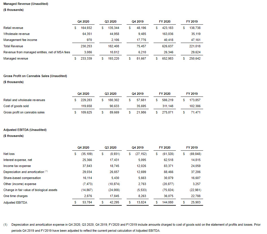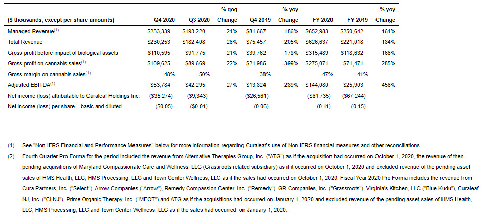 In this press release Curaleaf refers to certain non-IFRS financial measures such as “Pro Forma Revenue”, “Managed Revenue”, “Gross Profit on Cannabis Sales” and “Adjusted EBITDA”. These measures do not have any standardized meaning prescribed by IFRS and may not be comparable to similar measures presented by other issuers. Curaleaf defines “Managed Revenue” as total revenue plus revenue from entities for which the Company has a management contract but does not consolidate the financial results based on IFRS 10 – Consolidated Financial Statements. Curaleaf defines “Pro Forma Revenue” as “Managed Revenue” plus revenue from operations of pending and closed acquisitions as if such acquisitions occurred on January 1, 2020 for the Company’s fiscal year and as of October 1, 2020 for the Company’s fourth quarter. The Company defines “Gross Profit on Cannabis Sales” as retail and wholesale revenues less cost of goods sold. “Adjusted EBITDA” is defined by Curaleaf as earnings before interest, taxes, depreciation and amortization less share-based compensation expense and one-time charges related to business development, acquisition, financing and reorganization costs. Curaleaf considers these measures to be an important indicator of the financial strength and performance of our business. We believe the adjusted results presented provide relevant and useful information for investors because they clarify our actual operating performance, make it easier to compare our results with those of other companies and allow investors to review performance in the same way as our management. Since these measures are not calculated in accordance with IFRS, they should not be considered in isolation of, or as a substitute for, our reported results as indicators of our performance, and they may not be comparable to similarly named measures from other companies. The following tables provide a reconciliation of each of the non-IFRS measures to its closest IFRS measure.