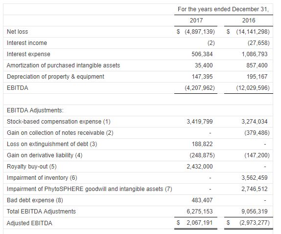 A reconciliation from the Company’s net loss to Adjusted EBITDA, a non-GAAP measure, for the years ended December 31, 2017 and 2016 is detailed below: