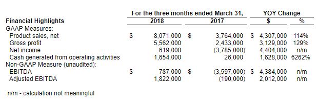 - Record Q1 2018 Sales of $8,071,000, an increase of 114% compared to Q1 2017