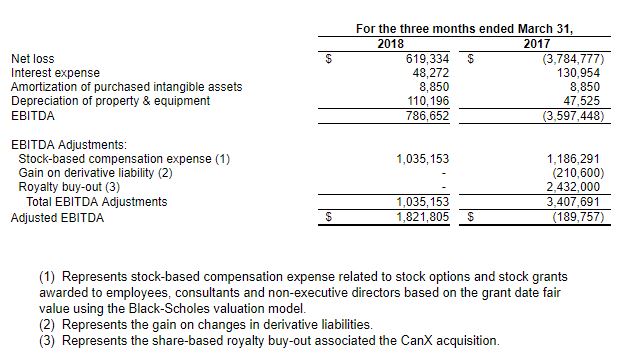 Adjusted EBITDA for Q1 2018 was $1.8 million and shows strong operating leverage from the Company’s significant investment in inventory, product development, systems, marketing and distribution.