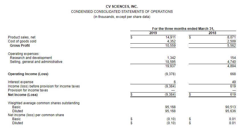 CV Sciences, Inc. Reports First Quarter 2019 Financial Results