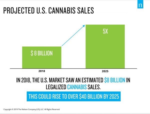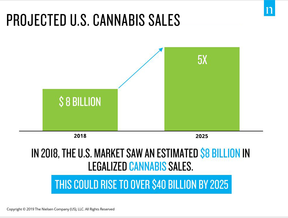 ¹Projected sales include $35 billion for marijuana products and $6 billion for hemp-derived CBD products. Marijuana projection presumes 75% of the U.S. adult population has consistent access to legal marijuana by 2025. Hemp-derived CBD projection presumes ingestible hemp-derived CBD products are legally available at major retailers and across retail channels.