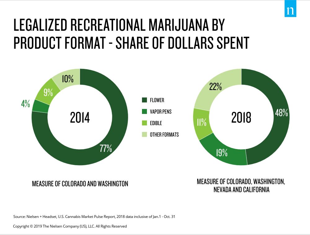 It’s more important than ever to prepare your brands and products for the demands of cannabis-interested consumers before the gates open to even broader assortment, distribution and messaging. For marijuana-based cannabis sold in licensed dispensaries in the handful of legalized recreational use states, the market has moved swiftly. We’ve seen dynamic shifts in marijuana product format preferences—even in the absence of traditional marketing power behind them. Where marijuana flower was once the format of choice in state-licensed dispensaries, it fell from a majority share of 77% in 2014 to just 48% of sales in 2018.