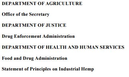 SUMMARY: The U.S. Department of Agriculture, in consultation with the U.S. Drug Enforcement Administration and the U.S. Food and Drug Administration, has developed a Statement of Principles on Industrial Hemp to inform the public how Federal law applies to activities associated with industrial hemp that is grown and cultivated in accordance with Section 7606 of the Agricultural Act of 2014.