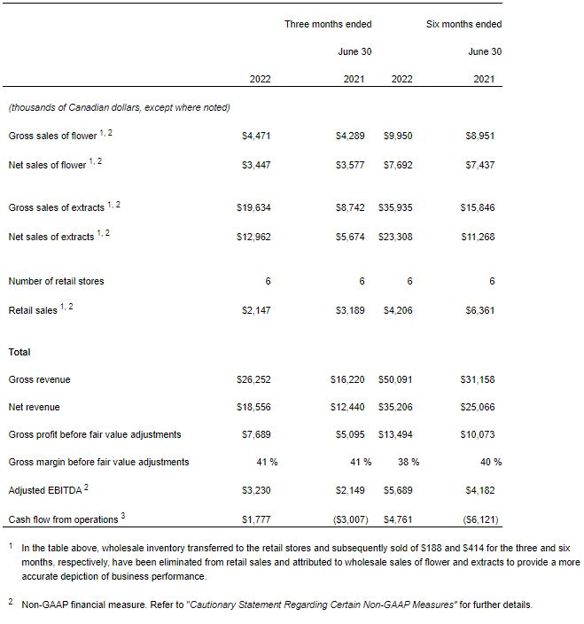 - Flower Sales: $3.4 million of net sales in Q2, a sequential decline of 19% over Q1 2022 and 10% over Q2 2021. During the period, sale of flower products was driven by reduced volumes during planned infrastructure optimization at the Thunderchild Facility.