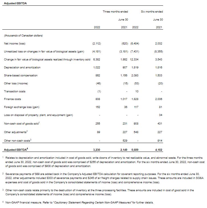 This press release contains certain financial performance measures that are not recognized or defined under IFRS (termed “Non-GAAP Measures”). As a result, this data may not be comparable to data presented by other licenced producers and cannabis companies. For an explanation of these measures to related comparable financial information presented in the Consolidated Financial Statements prepared in accordance with IFRS, refer to the discussion below. The Company believes that these Non-GAAP Measures are useful indicators of operating performance and are specifically used by management to assess the financial and operational performance of the Company. Accordingly, these Non-GAAP Measures are intended to provide additional information and should not be considered in isolation or as a substitute for measures of performance prepared in accordance with IFRS.