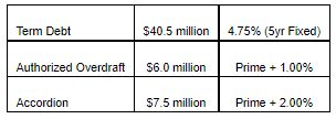 • Access to $12 Million of Additional Term Debt: The Company’s existing term debt will be increased by $12 million to $40.5 million, amortized over 12-years. The $12 million term debt will be accessible on request by Decibel. The Company expects the proceeds combined with contributions from operations to provide sufficient liquidity to repay Decibel’s convertible debentures on maturity.