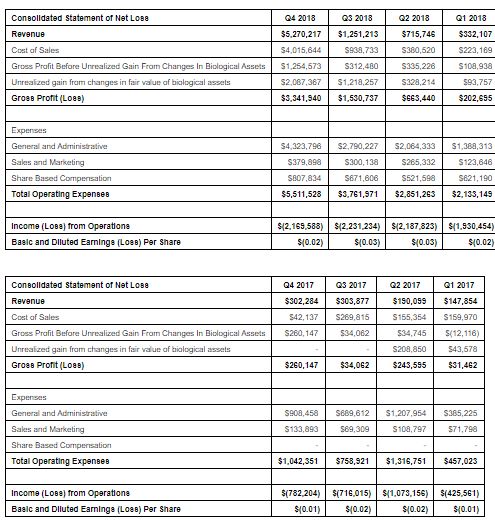 - Net income was a loss of $8.61M for the year ending December 31, 2018, primarily as a result of expanding operations in advance of legalization of recreational use cannabis in the fourth quarter of 2018.