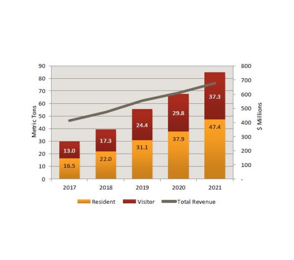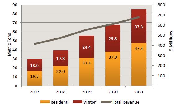 If out-of state visitors constitute 44 percent of social use cannabis demand as they do in Colorado, they will purchase 13 metric tons of cannabis from New Mexico dispensaries in the first full year of social use sales. Thirteen metric tons is roughly equivalent to 2.1 million out-of-state visitors each purchasing 6.2 grams.